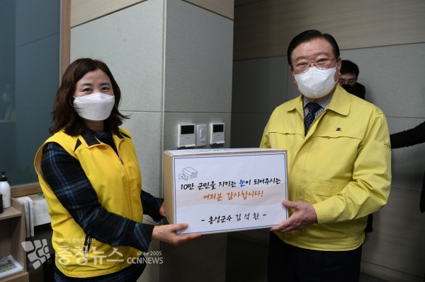 김석환 홍성군수는 18일 CCTV관제센터를 찾아 24시간 연중무휴 관리하는 근무자들을 격려하고 감사의 마음을 담은 간식을 전달했다.
