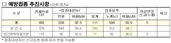이로써 서산시는 65세 미만 요양․정신병의원 및 요양시설 20개소, 639명중 594명을 예방접종해 누계실적은 93%이다.