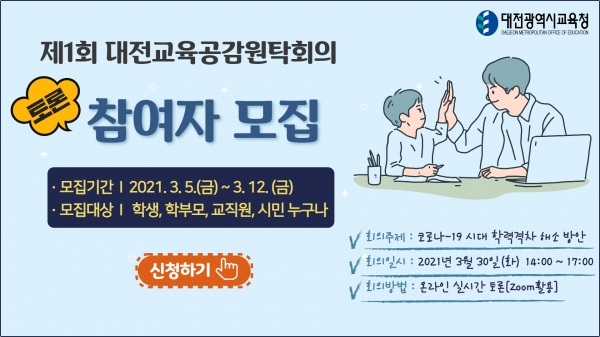 대전시교육청은 이같은 내용의 ‘2021년 제1회 온라인 대전교육공감원탁회의’에 참여할 토론자를 모집한다고 5일 밝혔다.