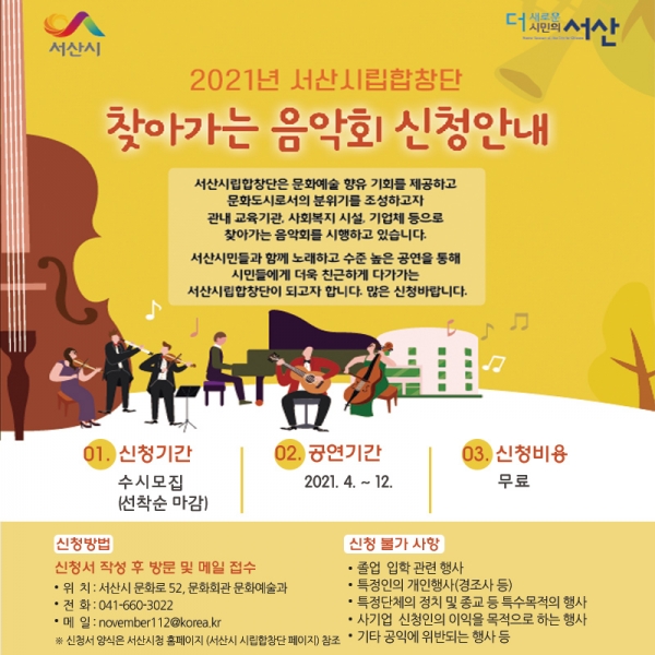 충남 서산시가 코로나19 극복을 위해 4월부터 관내 교육기관‧사회복지 시설 등을 대상으로 ‘2021년 찾아가는 음악회’를 실시한다.