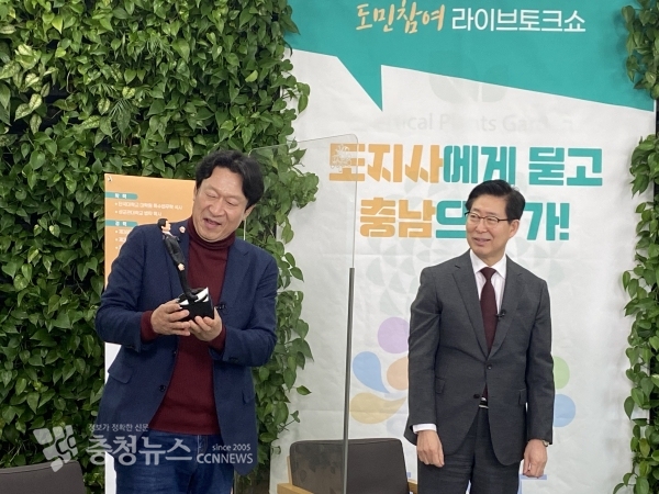 양승조 지사는 10일 도청에서 위촉식을 열고 김응수 배우에게 홍보대사 위촉패를 전달했다. 이후 유튜브를 통해 시청자들과 도정 퀴즈쇼를 함께하고, 다양한 질문에 답하며 격의 없이 소통했다.