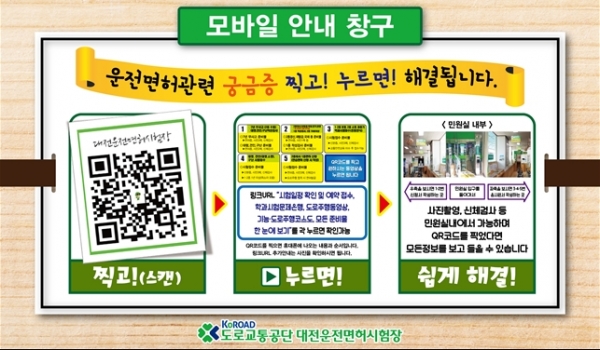 대전운전면허시험장(단장 문정식)은 코로나19 펜데믹을 극복하고 비대면 민원안내 및 온라인 시험접수 등을 강화하기 위해 모바일 안내창구를 확대 운영하고 있다고 16일 밝혔다.