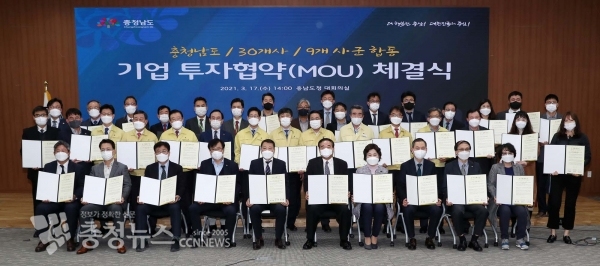 양승조 지사는 17일 도청 대회의실에서 박상돈 천안시장 등 9개 시·군 단체장, 김광수 제때 대표이사를 비롯한 30개 기업 대표와 투자협약(MOU)을 체결했다.