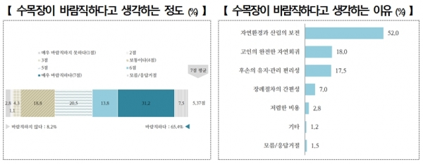 수목장이 바람직하다고 생각하는 이유에 대해서는, 자연환경과 산림의 보전(52%), 고인의 완전한 자연회귀(18%), 후손의 유지·관리 편리성(17.5%) 순으로 응답했다.