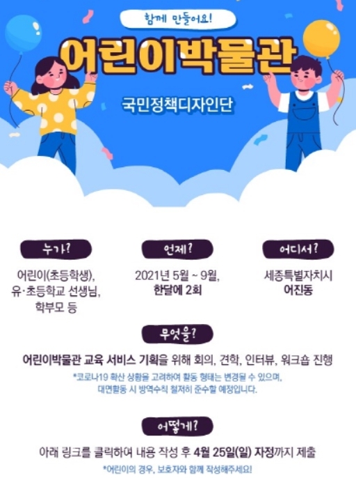 행정중심복합도시건설청(청장 이문기, 이하 행복청)은 11일 “2023년 개관 예정인 어린이박물관 건립 과정에 수요자의 요구를 충실히 반영하기 위해 국립박물관단지 국민정책디자인단을 모집한다”고 밝혔다.