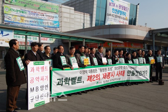민주당 대전시당(위원장 박범계) 당직자 및 당원 50여 명은 1일 오후 2시 대전역에서 이명박 대통령의 과학벨트 공약 파기 선언을 규탄하고, 설 명절을 맞아 귀향길에 오를 시민들을 상대로 과학벨트 충청 입지의 당위성을 담은 유인물을 배포하며 가두 홍보전을 펼쳤다.