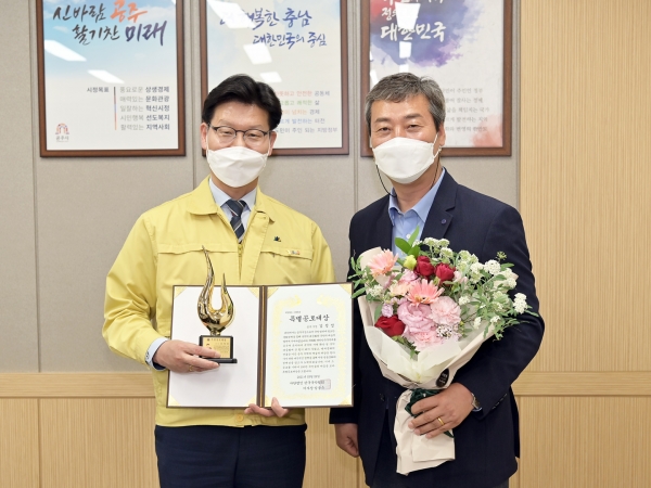 김정섭 공주시장이 국악의 발전과 대중화를 위해 노력한 공로를 인정받아 한국국악협회로부터 특별공로대상을 수상했다.
