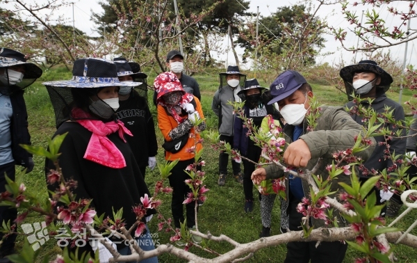 홍성군의회는 23일 코로나19로 일손이 부족한 금마면 죽림리 소재 박태진 농가를 찾아 고품질 복숭아 생산의 첫 단계인 적화(꽃따기) 작업을 전개하며 구슬땀을 흘렸다.