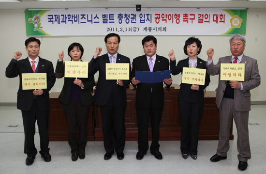 충청남도 계룡시의회(의장 류보선)는 11일 제66회 임시회 개회에 앞서 지난 1일 이명박 대통령의 국제과학비즈니스벨트 충청권 입지 공약파기 선언에 대해 4만 3천여 계룡시민과 함께 분노와 배신감을 느끼며 이명박 대통령의 과학벨트 충청권 조성 공약파기 선언 즉각 철회와 당초 공약한 원안대로 과학벨트를 충청권에 조속히 조성할 것을 촉구했다.