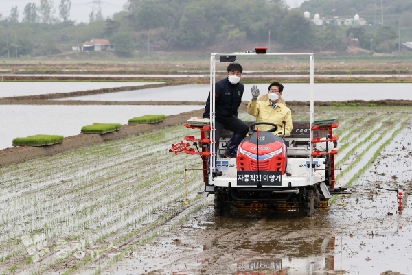 양 지사가 자율주행 이앙기에 탑승해 모내기를 하고 있다.
