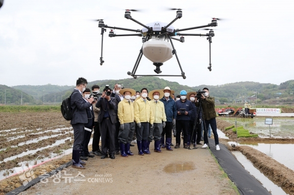 충남도가 자율주행과 드론을 벼 이앙·직파에 접목하는 신기술을 선보여 눈길을 끌고 있다.