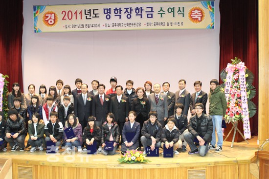 (주)진로(오양균 대전지점장)와 재단법인 명학장학회(이사장 최석원)는 공주대학교 산학연구원 대강당에서 15일 공주, 계룡시의 초.중.고.대학생 84명에게 장학금 전달식을 가졌으며, 지역사회의 인재발굴을 위한 초석이되는 명학장학사업이 지역사회에서 많은 찬사와 화제가 되고 있다.