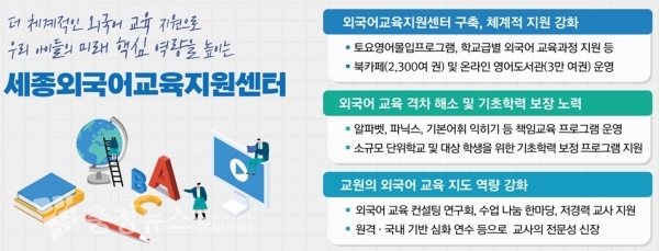 코로나19 장기화로 인한 외국어 교육 격차를 해소하고, 기초학력 보장을 위해 사각지대 우선 지원을 추진하고, 세종의 모든 학생이 영어 등 외국어를 즐겁게 배울 수 있도록 교원의 지도 역량을 고르게 강화해 나간다.