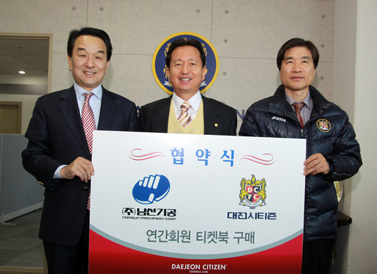 60년 전통의 대전 향토기업 남선기공 손종현 회장과 대전시티즌 김윤식 사장은 22일 대전시티즌 사무국에서 연간회원 티켓북 구매 협약식을 가지고 올시즌 축구특별시 부활을 위한 적극적인 협조를 약속했다.