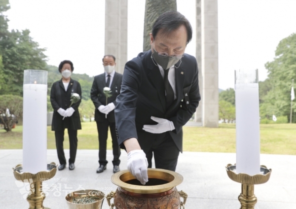 박상돈 천안시장이 제66회 현충일을 맞아 천안보훈공원에서 현충일 추념식 행사에 참석하고 헌화 및 분향을 하고 있다.