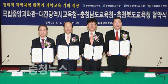 국립중앙과학관과 대전시교육청,충남.북 교육청은 4일 국립중앙과학관 세미나실에서 창의적 체험활동을 증진하고 과학교육의 활성화, 대중화를 위해 업무협약을 체결했다.