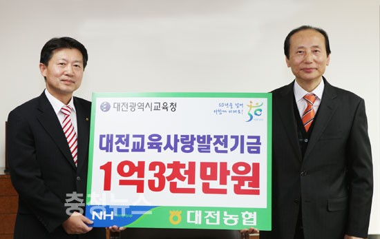 대전시교육청(교육감 김신호)은 8일 농협중앙회 대전지역본부(본부장 김종화)로 부터 대전교육사랑카드 적립기금 1억 3천 5백만원을 전달받았다.