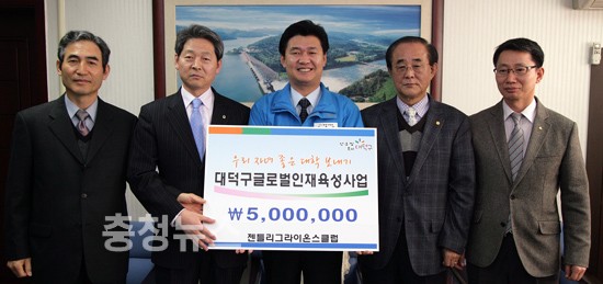 대전시 대덕구(구청장 정용기)는 대전젠틀리그 라이온스클럽(회장 한병주)에서 대덕구글로벌인재육성사업비로 성금 500만원을 대덕구일천원이웃사랑회에 기탁했다고 밝혔다.