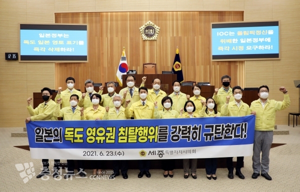 세종시의회는 23일 제69회 정례회 3차 본회의에서 ‘일본의 독도 영유권 침탈행위를 규탄하는 결의안’을 만장일치로 채택하고, 도쿄올림픽 홈페이지 지도에 독도를 일본의 영토로 표기한 일본 정부의 독도 영유권 침탈 행위에 대해 강력 규탄하고 즉각 삭제를 요구했다.