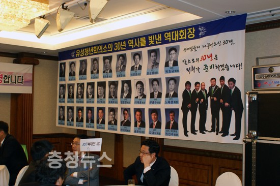 ▲ 역대 유성청년회의소 회장단들이 걸괘 현수막으로 걸려있다.