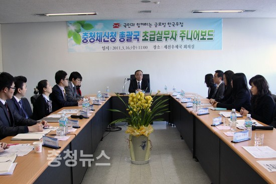 충청체신청(청장 이상진)은 수평적 의사소통을 활성화하고 현장의 창의적인 아이디어를 2011년도 사업추진에 적극 활용하기 위해 16일 충청체신청 주니어보드 및 하모니미팅이 제천우체국에서 열렸다고 밝혔다.