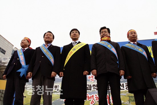 한편, 이날 참석한 국회의원만 해도 대전의 임영호 의원, 권선택 의원, 박병석 의원, 이재선 의원, 김창수 의원, 충북의 오제세 의원, 이용희 의원, 정범구 의원, 충남의 심대평 의원 등이며 염홍철 대전시장, 안희정 충남지사, 이시종 충북지사, 이상태 대전시의회 의장, 유병기 충남도의회 의장, 김형근 충북도의회 의장 등이 참석해 과학벨트에 대한 충청인의 염원을 표현했다.