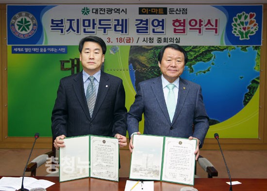 대전시의 새 복지모델인‘복지만두레’사업에 청신호가 켜졌다. 외지기업으로선 처음으로 (주)신세계 이마트 둔산점이 대전시 새 복지모델인 복지만두레 결연사업에 손을 내밀었다.