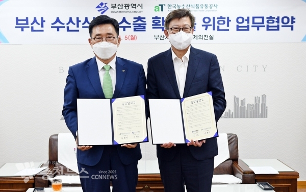 한국농수산식품유통공사(aT, 사장 김춘진)와 부산광역시(시장 박형준)는 5일 부산시청에서 수산식품 수출 확대를 위한 업무협약을 체결했다.