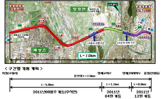 국토해양부 대전국토관리청이 이명수 의원에게 보고한 자료에 따르면, 지난해 말부터 금년 초까지 예년에 비해 혹한(67일) 및 강설(30일, 적설량 5~15cm)이 장기간 지속되어 콘크리트 및 아스콘 포설 등의 작업이 60일 정도 중단됐고, 휴대사거리 구간 집단민원 발생으로 램프 연결 공사가 지연되어 공사 일정에 큰 차질을 빚게 됐다고 밝혔다.