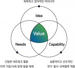 ‘INC’는 독특하고 창의적인 아이디어(Idea), 긴밀한 네트워크를 활용한 지역 기업 및 사회 문제(Needs) 발굴 체제, 실용적이고 선도적인 연구‧봉사‧산학협력 역량(Capability)을 기반으로 한 한밭대학교 고유의 산학협력 추진 전략 브랜드로서, 세 가지의 접점에서 새로운 가치를 창출하고자 하는 가치창출형 산학협력 특화 모델이다.