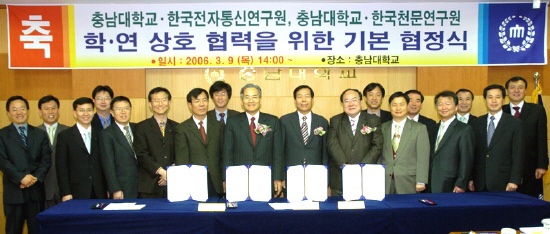 충남대는 3월 9일 오후 2시 대학본부 대회의실에서 양현수 총장과 임주환 ETRI 원장, 박석재 KASI 원장 등 해당 기관 관계자들이 참석한 가운데 상호협력을 위한 학-연 협정식을 가졌다.