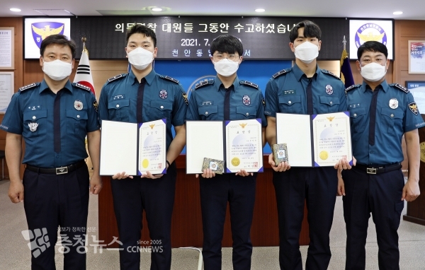 천안동남경찰서(서장 총경 백남익)는 30일 천안동남서 의무경찰 112타격대 폐지를 앞두고, 29일 오전 천안동남경찰서 중회의실에서 112타격대원 표창 수여 및 환송 행사를 개최했다.