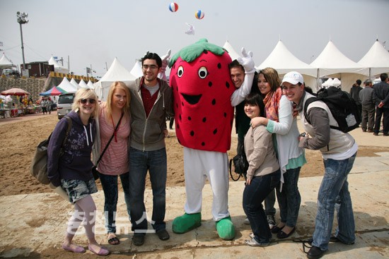 ▲ 외국인이 딸기 축제캐릭터와 포즈를 취하고 있다.