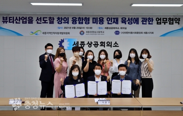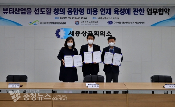 세종상공회의소 세종지역인적자원개발위원회(공동위원장 이두식, 조상호)는 25일 오전 10시 세종상의 회의실에서 세종장영실고등학교, 사단법인 대한미용사회중앙회 세종시지회와 함께 ‘뷰티산업을 선도할 창의 융합형 미용인재 육성을 위한 업무협약’을 체결했다.