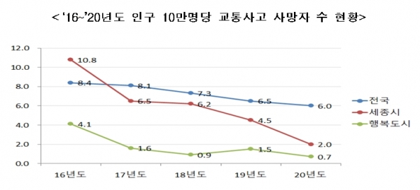 행복청이 2020년 교통사고 통계(경찰청 자료 참고)를 분석한 결과, 행정중심복합도시 인구 10만명당 교통사고 사망자 수는 0.7명으로 전국 평균 6명, 경제 협력 개발 기구(OECD)국가 평균 5.6명(‘18년기준) 보다 현저히 낮은 수준이며, 보행 중 사망사고는 발생하지 않았고, 인구 대비 전국 최저 수준의 교통 사고율을 보이고 있다.
