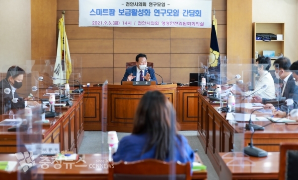 천안시의회(의장 황천순) ‘스마트팜 보급활성화 연구모임(허욱 (대표의원), 정도희, 김철환, 유영진, 이은상, 이준용, 권오중)’은 3일 시의회 행정안전위원회 회의실에서 간담회를 가졌다.