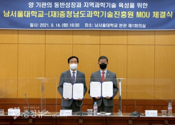 남서울대학교(총장 윤승용)는 14일 (재)충청남도과학기술진흥원(원장 김광선)과 양 기관 동반성장과 지역과학기술 육성을 위한 MOU를 본관 제1회의실에서 체결했다.