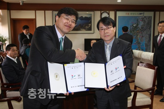 ▲ 이두훈 태안군수권한대행이 대한씨름협회와 협약서를 교환했다.