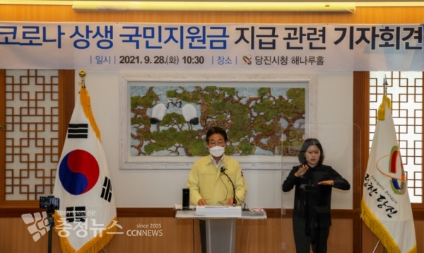 김홍장 당진시장은 28일 브리핑을 통해 "상생 국민지원금 지급이 제외된 12%의 시민에게 지급하지 않는 대신 우리시 소상공인을 대상으로 경제적 지원을 두텁게 하는 것에 초점을 맞추겠다"고 밝혔다.