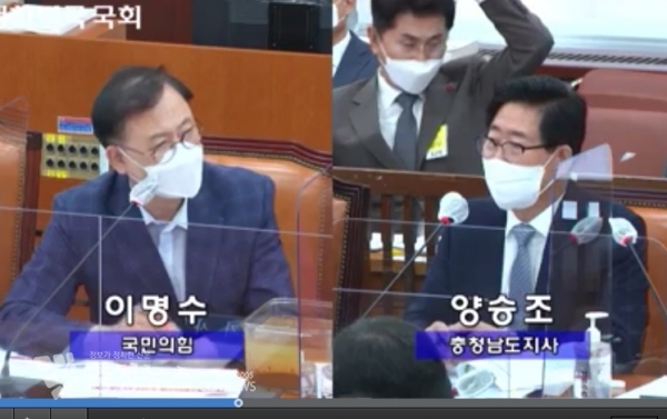 12일 열린 행정안전부의 충남도 국감에서 이명수 의원은 양 지사가 복지정책에 많은 예산을 투입하고 있지만, 드러나는 성과는 없다고 문제를 제기했고 양 지사는 복지정책뿐만 아니라 미래성장동력에서 치중하고 있다고 반박, 공방이 오갔다.