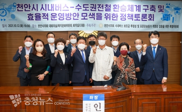 천안시의회(의장 황천순) 시내버스 보조금 투명성 및 표준운송원가 적정성 검증을 위한 특별위원회는 12일 천안시의회 복지문화위원회 회의실에서 ‘천안시 시내버스-수도권전철 환승 구축 방안 모색’을 주제로 토론회를 개최했다.