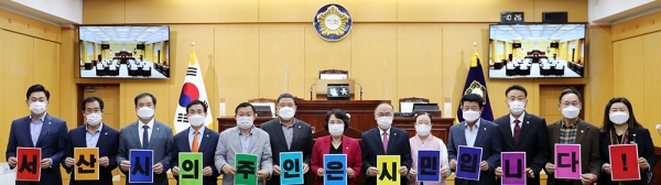 서산시의회는 28일 시의회 본회의장에서 ‘서산시의 주인은 시민입니다!’라는 주제로 손피케팅 퍼포먼스를 진행했다. 서산시의회 13명의 의원들은 각자 손피켓 한 장씩을 손에 들고 지방자치의 의미와 주민 참여의 중요성을 되새기며 서산시의회 슬로건을 표현했다.