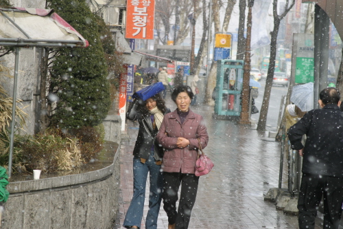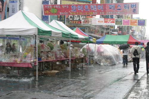 13일 하루, 눈 덮힌 'White' 데이 속 '화이트데이(사탕을 주고 받는 날)'를 실감케 했지만 거리 곳곳에 진열된 사탕바구니와 꽃바구니 등 연인을 위한 선물들은 꽃샘추위로 외면당했다. 가게업주들은 여느 때와 달리 썰렁함에 울상.대전지방기상청에 따르면 이번 추위는 내일까지 계속되다가, 모레(15일)부터 차츰 풀릴 것으로 전망했다.