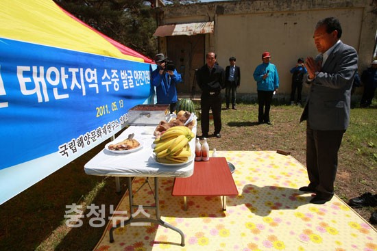 충남 태안군(군수 진태구)은 지난 13일 근흥면 안흥초 마도분교 운동장에서 수중 문화재 발굴단의 무사안전을 기원하는 ‘2011 태안지역 수중 문화재 발굴 안전 기원제’를 개최했다.
