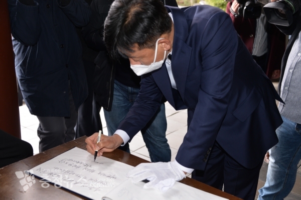 이날 현충사 참배 방명록에는 "사즉생(死卽生)각오로 소중한 일상 안전하게 지켜내겠습니다. 대한민국 최고의 안전한 도시를 만들겠습니다"라고 적었다.