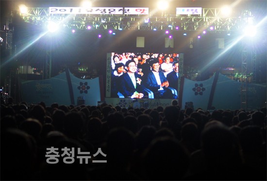 ▲ 안희정 충남지사와 허태정 유성구청장이 대형스크린에 잡혔다.
