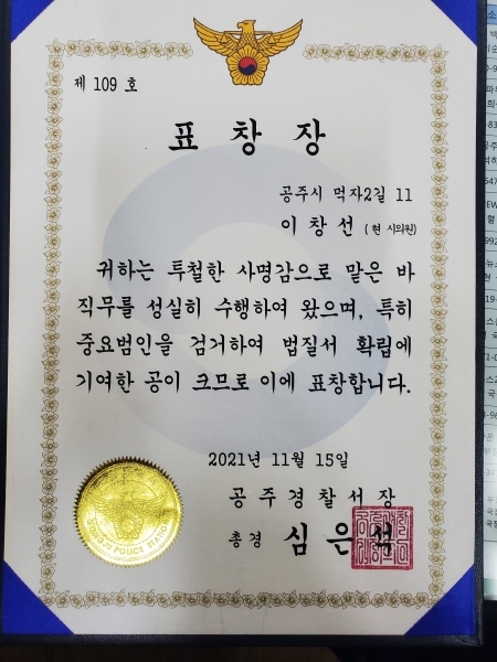 한편 이창선 의원은 이러한 공로를 인정받아 지난 15일 공주경찰서로부터 표창장을 수여받았다.