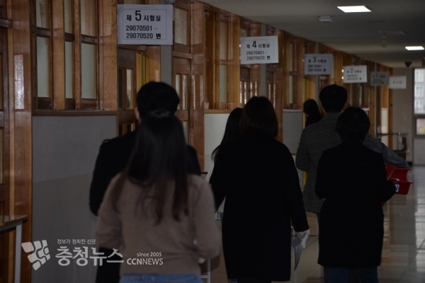 이날 오전 세종 제29 시험지구 제 7시험장 양지고 앞에는 교통정리를 하는 경찰관들의 안내에 따라 수험생들은 마스크로 얼굴을 가린 채 응원 플래카드 하나 없는 시험장 안으로 들어섰다.