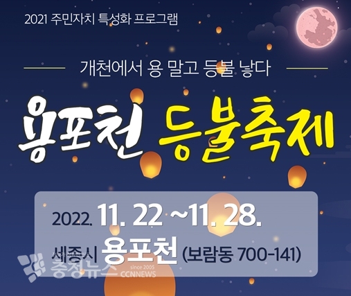 [충청뉴스 최형순 기자] 세종특별자치시 보람동(동장 강민규) 주민자치회(회장 박윤경)와 금남면(면장 진승기) 주민자치회(회장 박종권)가 22일 ~ 28일 까지 ‘개천에서 용말고 등불 낳다’라는 주제로 ‘용포천 등불축제’를 개최한다.