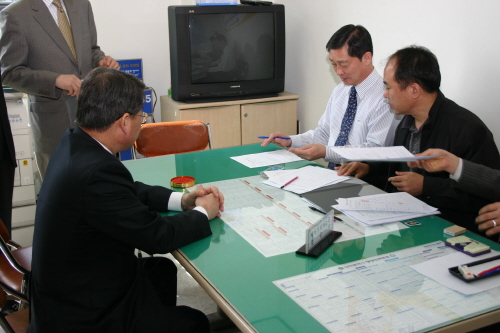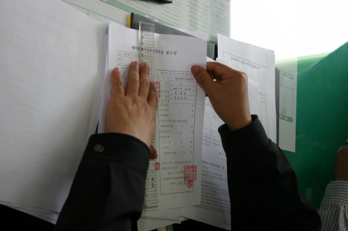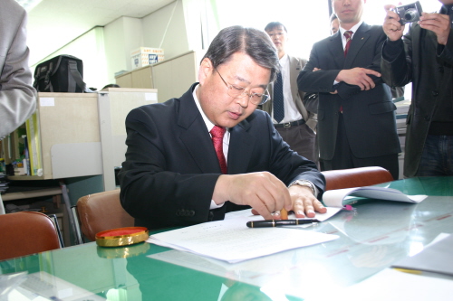 | ▲ 박성효 전 대전광역시 정부 부시장이 등록을 마친후 선거관리위원회의 바뀐 선거법 내용에 대해서 설명을 듣고 있다. | ||